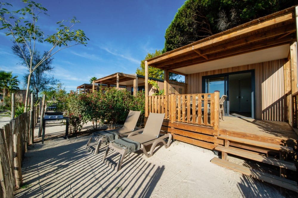 Genießen Sie einen einzigartigen Aufenthalt auf dem Camping des Mûres, im Herzen des Golfs von Saint-Tropez, in unserem Mobilheim Confort Plus Strandseite (mittlere Reihe).