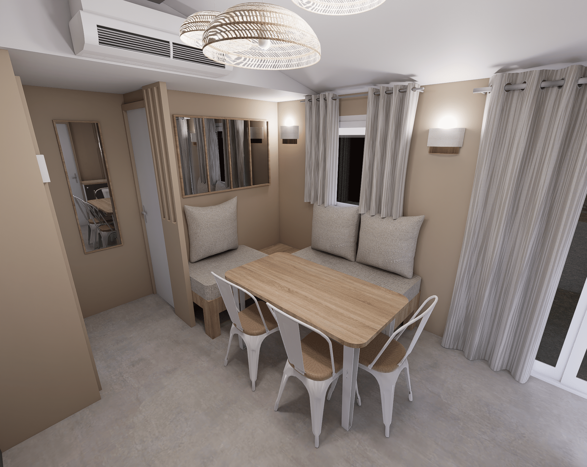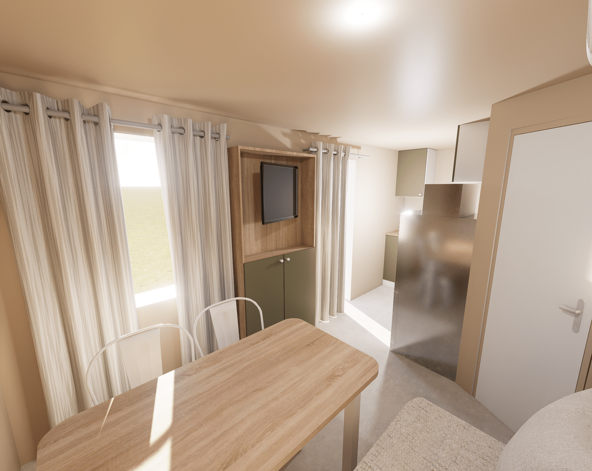 All’interno, Coco dispone di un angolo cottura con piano di lavoro per preparare pasti gustosi, frigorifero e forno a microonde, un pratico spazio per riporre gli oggetti e un tavolo e poltrone da esterno.