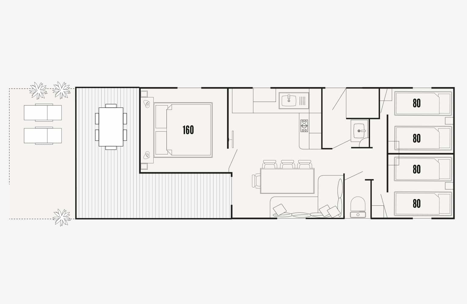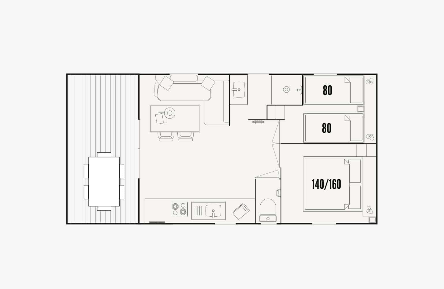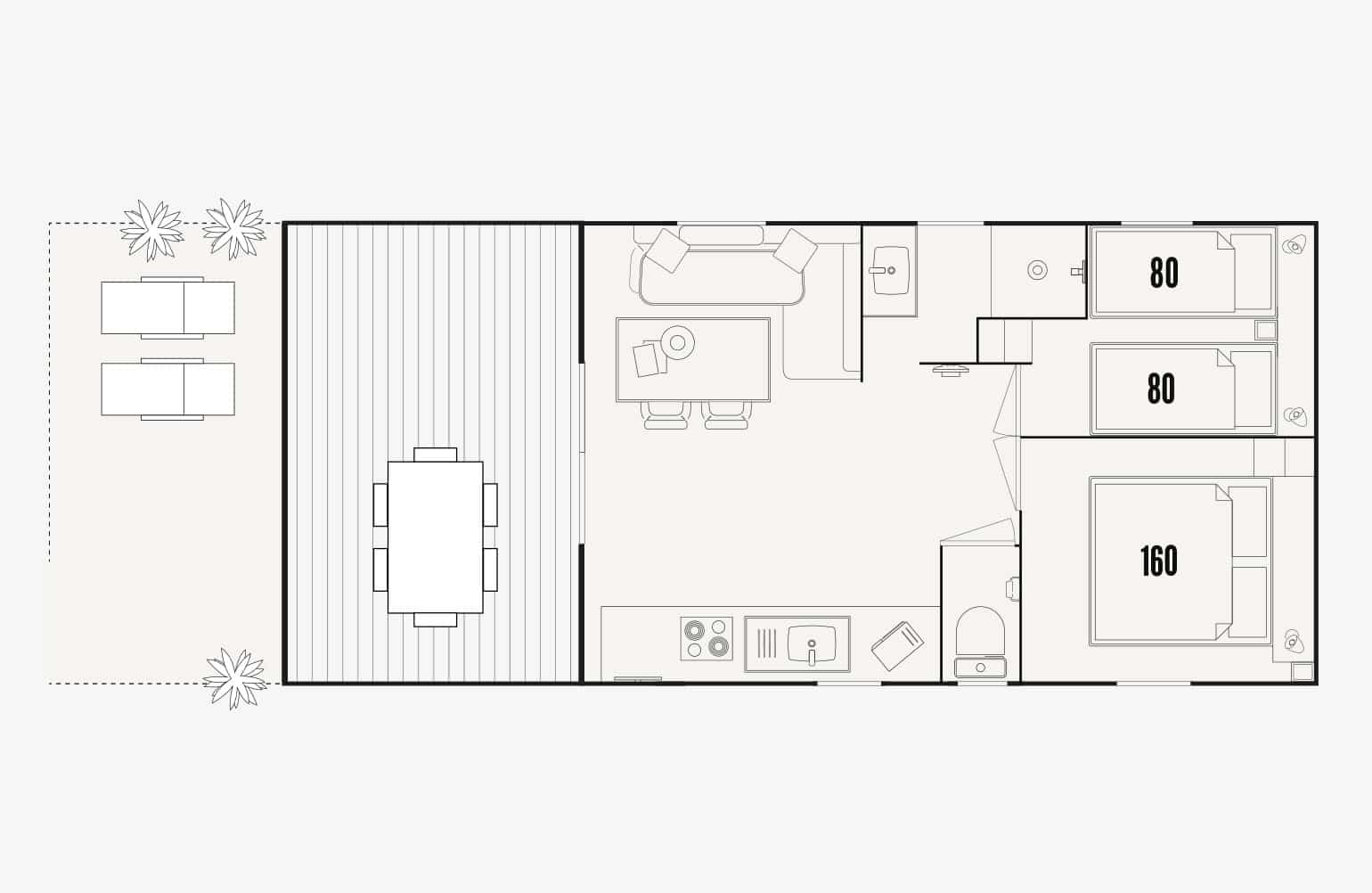 Découvrez notre nouveau mobil-home Prestige, situé en deuxième ligne côté plage. Profitez d’un confort optimal et d’équipements modernes pour des vacances inoubliables. Ce mobil-home spacieux dispose d’un grand salon et de deux chambres séparées pour vous offrir un maximum d’intimité et de confort. À l’extérieur, bénéficiez d’un espace privé avec transats et plancha pour des moments de détente exclusifs.